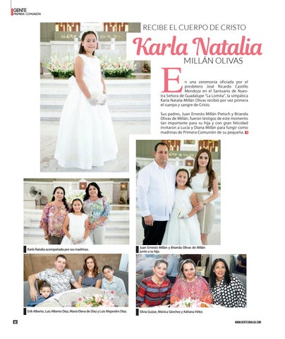 n una ceremonia oficiada por el presbítero José Ricardo Castillo Mendoza en el Santuario de Nuestra Señora de Guadalupe “La Lomita”, la simpática Karla Natalia Millán Olivas recibió por vez primera el cuerpo y sangre de Cristo. Sus padres, Juan Ernesto Millán Pietsch y Brianda Olivas de Millán, fueron testigos de este momento tan importante para su hija y con gran felicidad invitaron a Lucía y Diana Millán para fungir como madrinas de Primera Comunión de su pequeña.