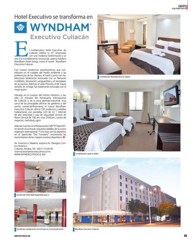 l emblemático Hotel Executivo de Culiacán celebra su 41°aniversario con una moderna trasformación y se une a la mundialmente reconocida cadena hotelera Wyndham Hotel Group, como el nuevo Wyndham Executivo Culiacán. Con nuevas tendencias arquitectónicas que contribuyen en el cuidado del medio ambiente y las preferencias de los clientes, el hotel cuenta con habitaciones totalmente renovadas con un flamante mobiliario, decoración vanguardista y el reemplazo de accesorios. Además, el salón Floresta, el de mayor tamaño en el lugar fue totalmente renovado con el mejor gusto.