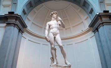 Michelangelo também protagoniza o acervo do Bargello, incluindo uma escultura inacabada que é um misto de Apolo com Davi e uma do deus romano Baco. Mas é em outro endereço, a Galleria dell’Accademia, que reside a obra-prima de Michelangelo: a famosa escultura de Davi , com cinco metros de altura. Dona de uma anatomia perfeita, foi trazida à vida a partir de um único bloco de mármore, com tendões e veias tão bem delineados que parecem ter sido talhados em uma superfície macia como a própria pele humana. É interessante também notar as obras na lateral do corredor, conhecidas como Prisioneiros ou Escravos – mármores trabalhados por Michelangelo, mas não finalizados.