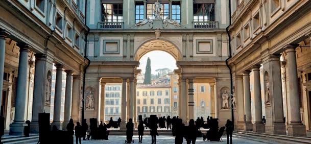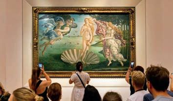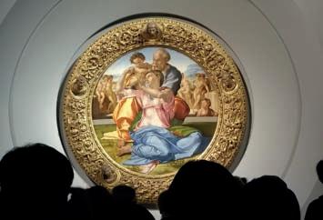 Michelangelo marca presença com um retrato da Sagrada Família conhecida como Doni Tondo . Leonardo Da Vinci, que nasceu em um vilarejo próximo a Florença, aparece com as pinturas Anunciação , Batismo de Cristo e a inacabada AdoraçãodosMagos . Caravaggio também merece menção, com seu domínio da técnica do claro-escuro, como se vê na famosa Medusa . Por fim, Botticelli brilha com A Primavera e Nascimento de Vênus .