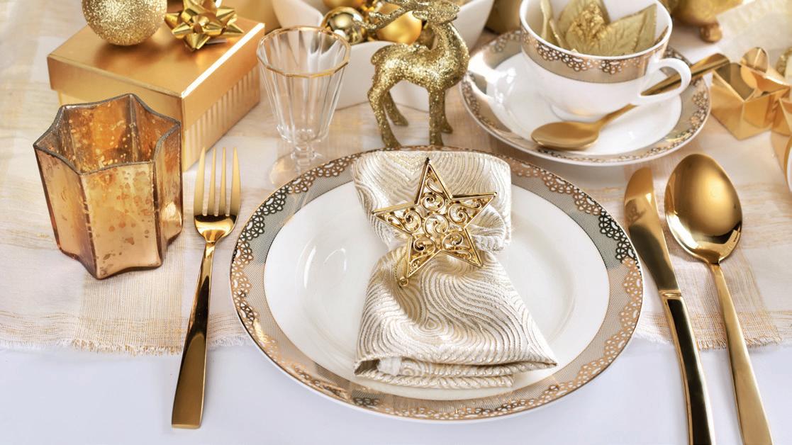 Na loja Camicado, a House Manager Marise di Mattina optou por uma mesa elegante com tons de dourado, com arranjo central com folhas, pinha e uma vela inserida em um porta-vela de vidro. As argolas com contas em branco e dourado envolveram os guardanapos, e foi usada uma toalha ao estilo caminho de mesa.