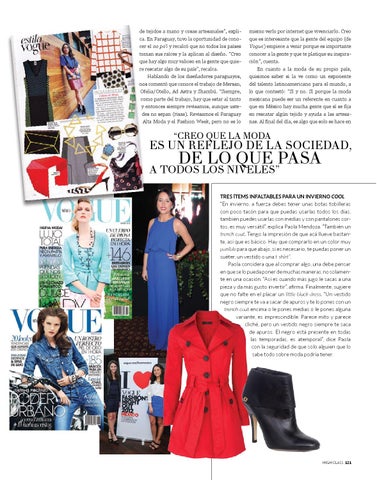 de tejidos a mano y cosas artesanales”, explica. En Paraguay, tuvo la oportunidad de conocer el ao po’i y recalcó que no todos los países toman sus raíces y la aplican al diseño. “Creo que hay algo muy valioso en la gente que quiere rescatar algo de su país”, recalca. Hablando de los diseñadores paraguayos, nos comentó que conoce el trabajo de Mersan, Ofelia/Otello, Ad Astra y Shambú. “Siempre, como parte del trabajo, hay que estar al tanto y entonces siempre revisamos, aunque ustedes no sepan (risas). Revisamos el Paraguay Alta Moda y el Fashion Week, pero no es lo