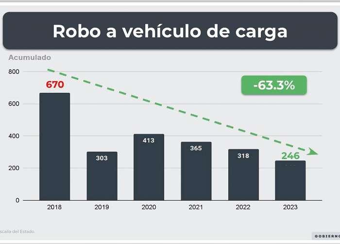 De acuerdo con los datos emitidos por el Secretariado Ejecutivo del Sistema Nacional de Seguridad Pública, en el corte anual de 2018 a 2023, la disminución en robo a vehículo de carga pesada ha significado el menos 63.3 por ciento, pasando de 670 casos en 2018 a 246 el año pasado.