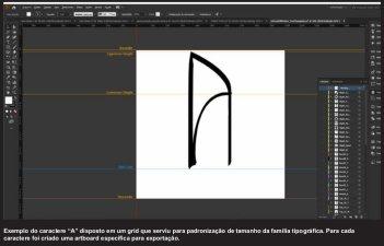 Adobe Illustrator foi a exportação individual de cada um dos 62 caracteres em formato .svg (sigla em inglês que significa gráficos vetoriais ecalonáveis), com um grid único para poderem ser usados no software específico de geração de typefaces, FontForge. Exemplo do caractere “A” disposto em um grid que serviu para padronização de tamanho da família tipográfica Para cada caractere foi criado uma artboard específica para exportação