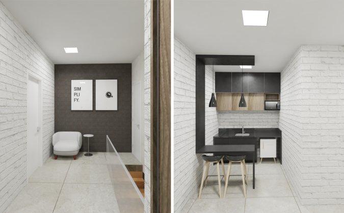 A loja, uma sala térra, fica localizado no centro comercial City Life e possui uma área total de 70, 58m² distribuida em dois pavimentos, sendo um composto por um mezanino.