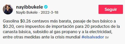 Bukele no gusta de dar declaraciones a los medios de comunicación tradicionales, sin embargo, ha sorprendido en redes sociales dando una amena y distendida entrevista al conocido youtuber mexicano Luisito comunica, poniendo en evidencia que sabe y puede comunicar con éxito de manera distinta. Utiliza la red social Tik Tok como alternativa, un ejemplo claro es el video del 19 de marzo de 2022 en el que el presidente anunció que tomaría acciones para contrarrestar la inflación y mitigar el impacto sobre la economía salvadoreña. Estas medidas estaban orientadas a evitar el aumento de precios en los productos de la canasta básica y poner énfasis en la baja del precio de los combustibles, subsidiando el producto con la intención de potenciar la economía salvadoreña y buscar el crecimiento. Estos mensajes fueron vistos por más de 1,6 millones de seguidores.