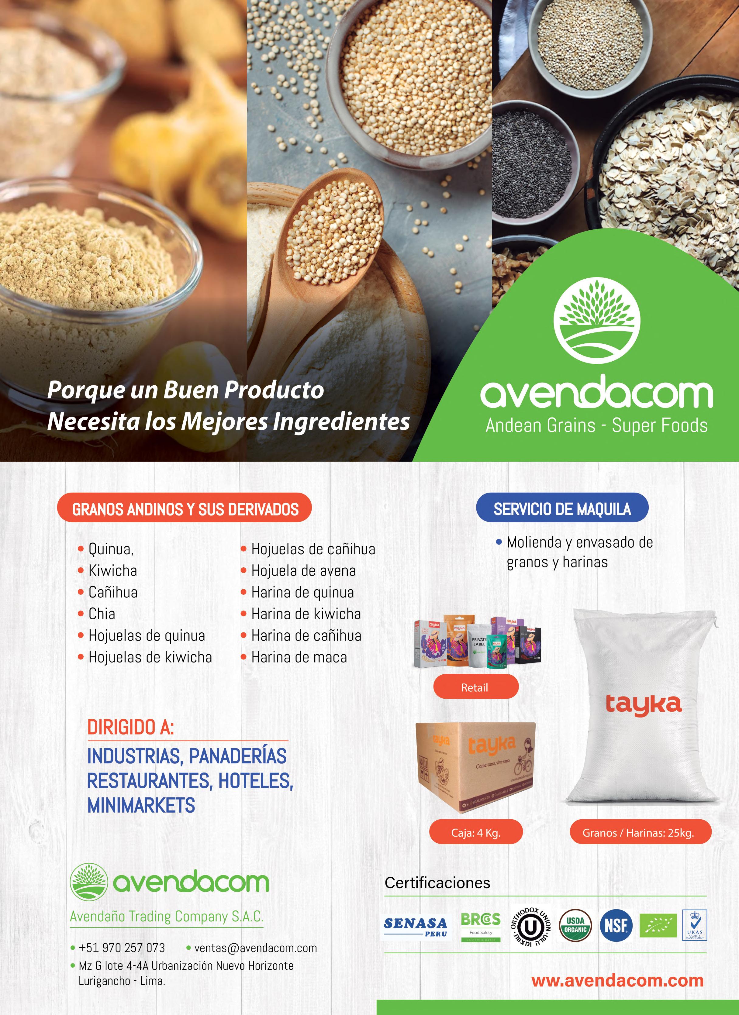 Productos: Quinua, Kiwicha, Cañihua, Chía, Harina de quinua, Harina de kiwicha, Harina de cañihua, Harina de maca, Hojuela de quinua, Hojuela de kiwicha, Hojuela de cañihua, Hojuela de avena, Frutos secos, etc.