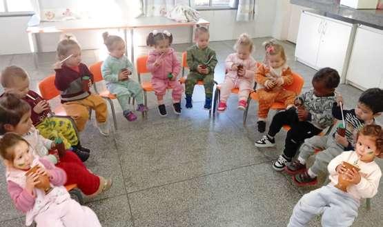 Maternal 1 realizando a atividade "Chá dos avós" com relatos da chegada na cidade e suas primeiras moradias, contextualizada com a história dos "Três porquinhos"