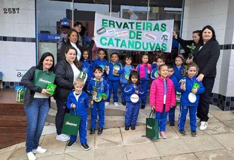 Alunos do Maternal 2 integral realizando a coleta de folhas de erva mate