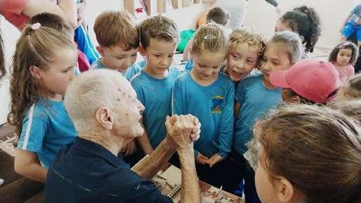Primeiros e segundos anos participaram de uma conversa com a senhora Mercedes Aires Bucco sobre a chegada das primeiras famílias em Catanduvas e o modo de vida da época