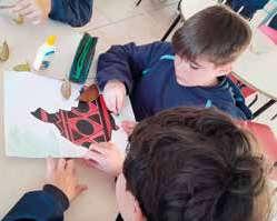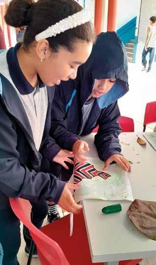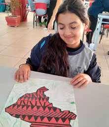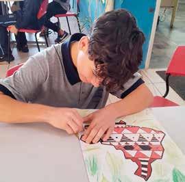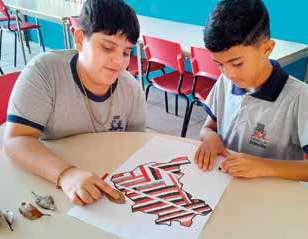 A partir do estudo sobre grafismo indígena nas aulas de Artes, os alunos do sexto ano reproduziram os próprios elementos no mapa do Brasil, com cores características e materiais naturais.