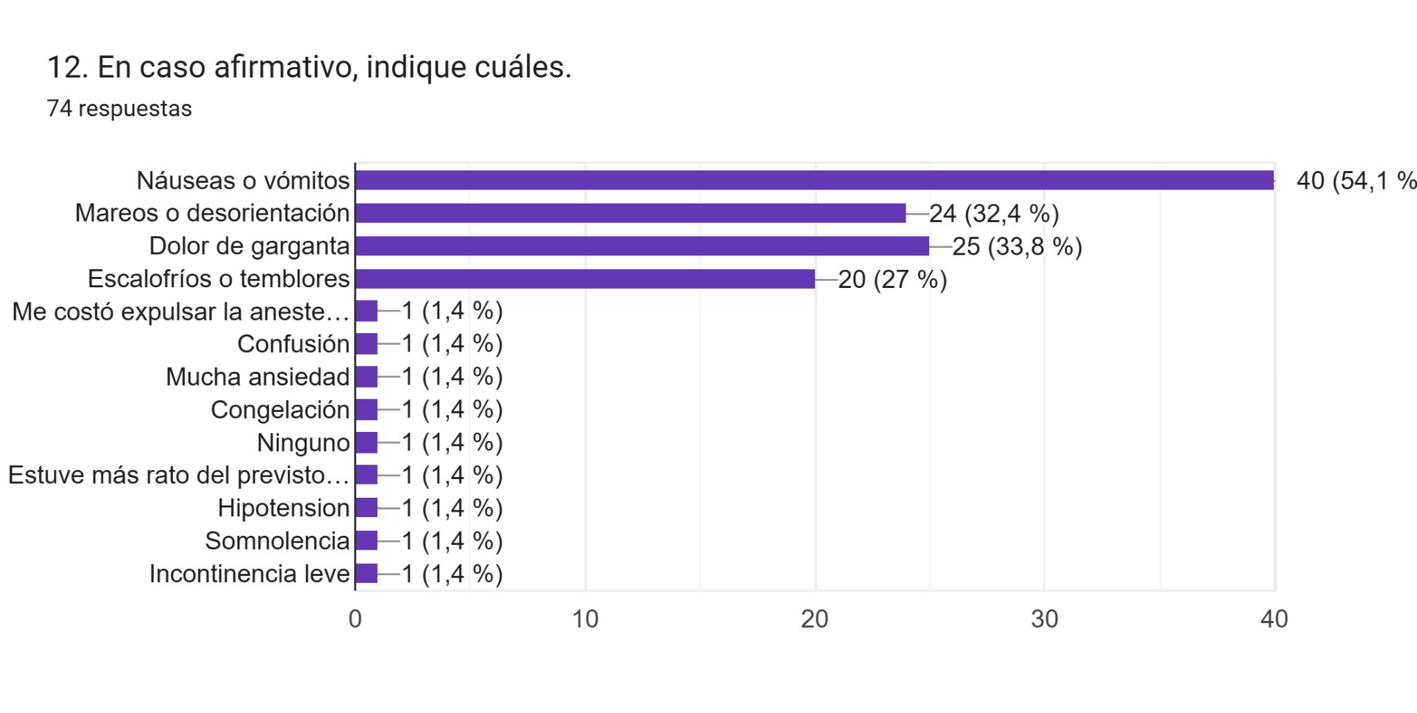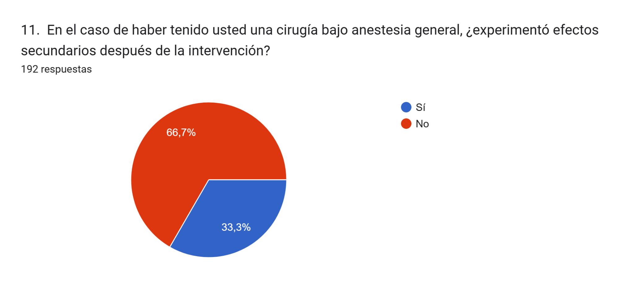 Los resultados de laencuestarevelanqueun56%delosencuestadostieneexperienciaprevia con cirugías bajo anestesia general. Por lo tanto, han sido informados de una forma obligatoria sobre los riesgos que conlleva. Sin embargo, 26 encuestados, dijeron no conocerlos, quizá debido a la decisión de afrontar laoperacióndelamejormaneraposible,y estarconelmenorriesgodeestrésypreocupación,ayudandoaunarealizaciónmásllevadera.