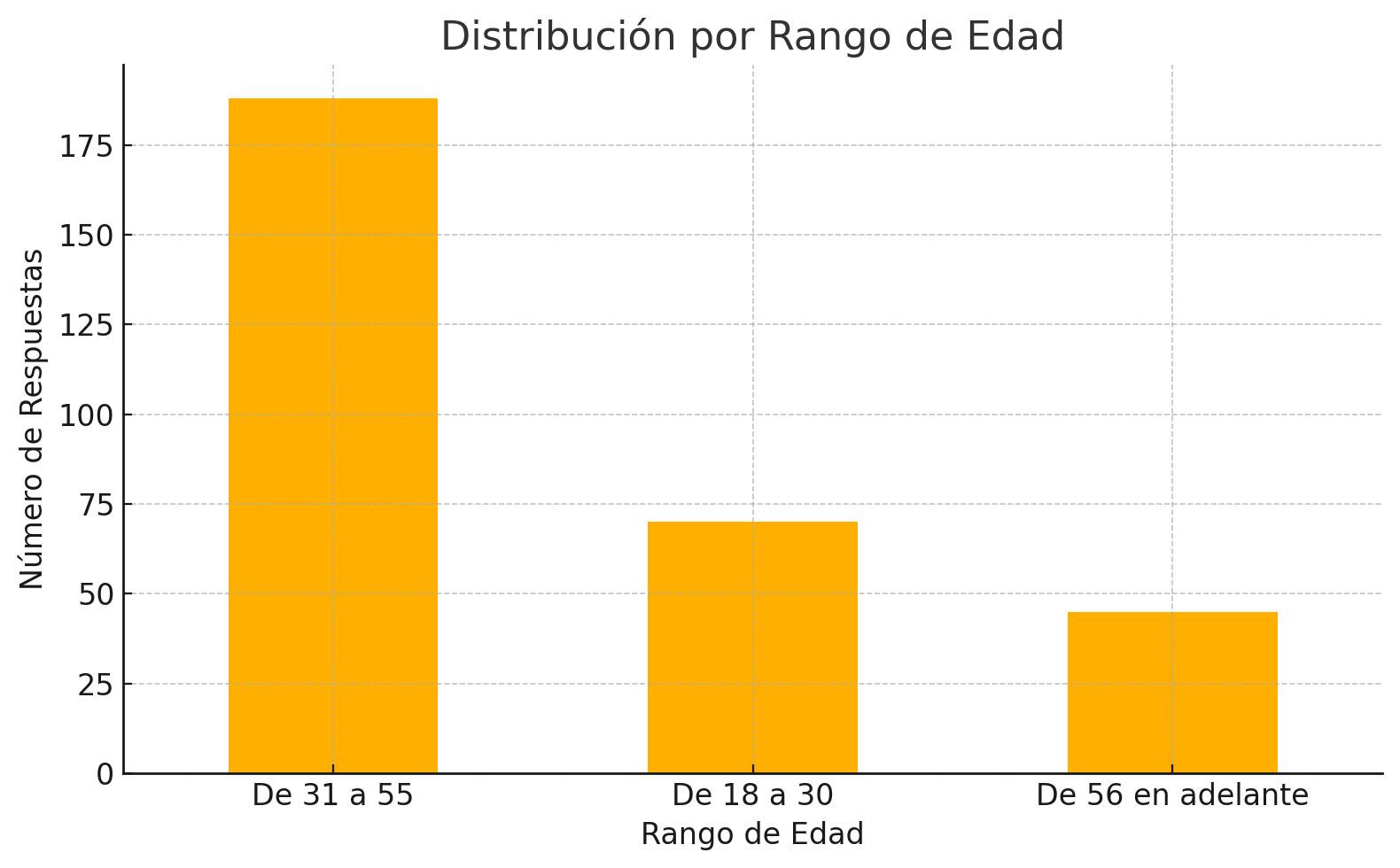 Este gráficomuestraladistribuciónporrangosdeedaddelaspersonasencuestadas.Sepuede observar como hay una mayoría de respuestas del grupo de 31 a 55 años, seguido del grupo de18a30añosyporúltimoelde56añosenadelante.