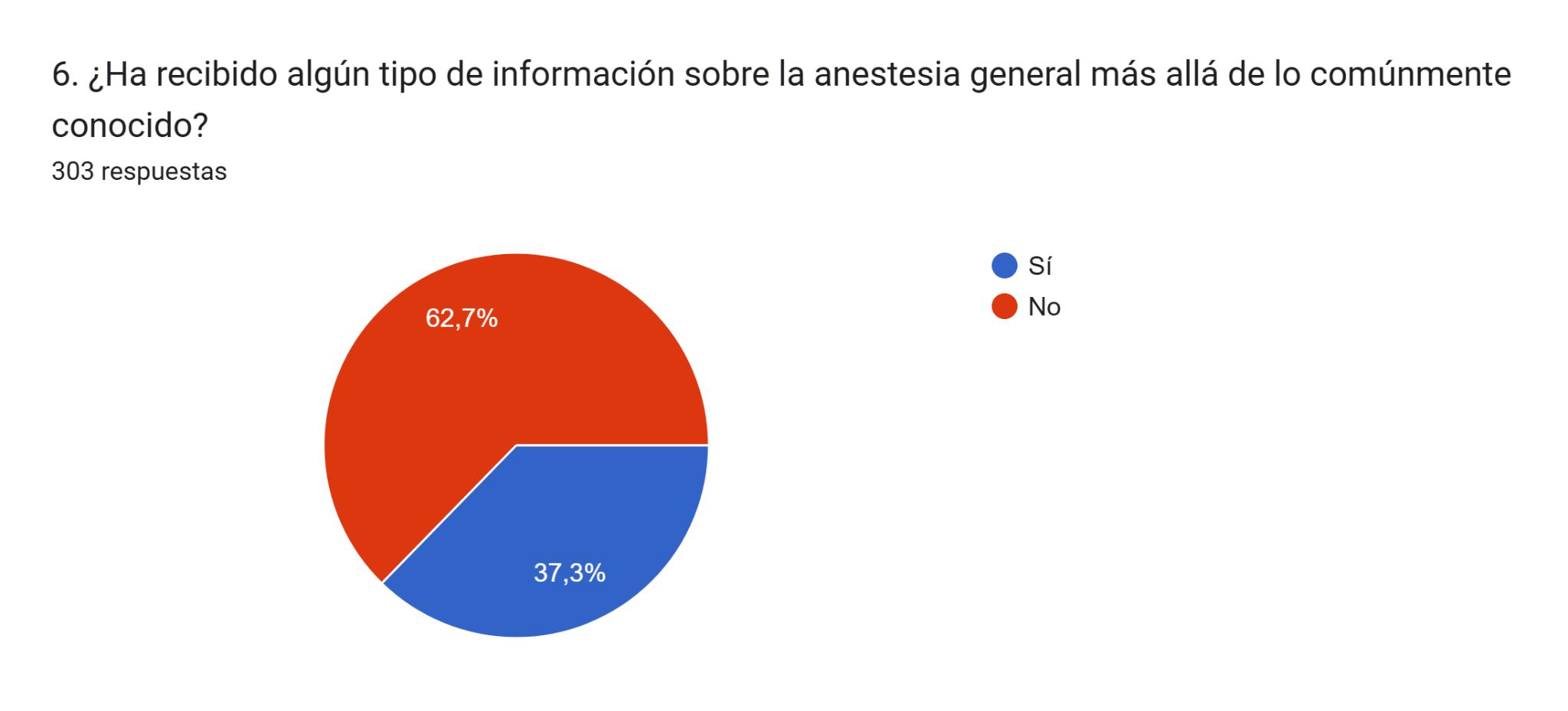 Al contrario, de las 297 personas que contestaron afirmativo a saber lo que es la anestesia general, 150 no dieron una respuesta válida. Algunos ejemplos son Te duermen entera o Ausencia de dolor. Esto sugiere que muchas personas tienen una percepción errónea o incompletadesuconocimientodelaanestesiageneral.