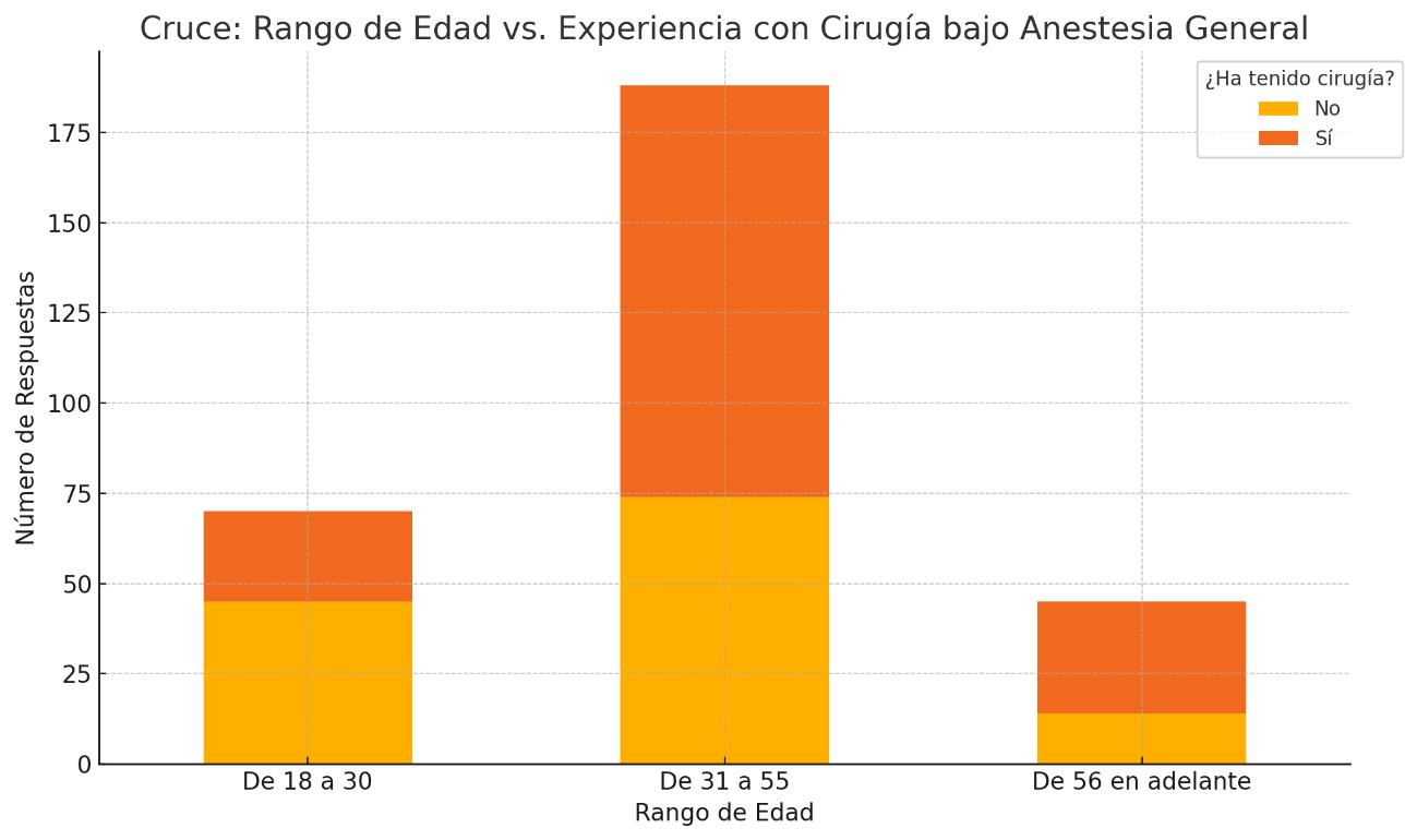 De quienes afirmaron conocer los riesgos (pregunta 4) solo el 30% pudieron indicar riesgos específicos. Los resultados muestran que el grupo de 31 a 55 años, ha tenido una mayor proporción de personas con más experiencia previa, con un 70%. Por otro lado, los encuestados de 18 a 30 años, han presentado un menor grado de experiencia previa con un 40%.Entremediasencontramosalgrupode56añosenadelanteconunaexperienciabastante alta.De45personas,33(73.3%)hanestadobajolosefectosdelaanestesiageneral.
