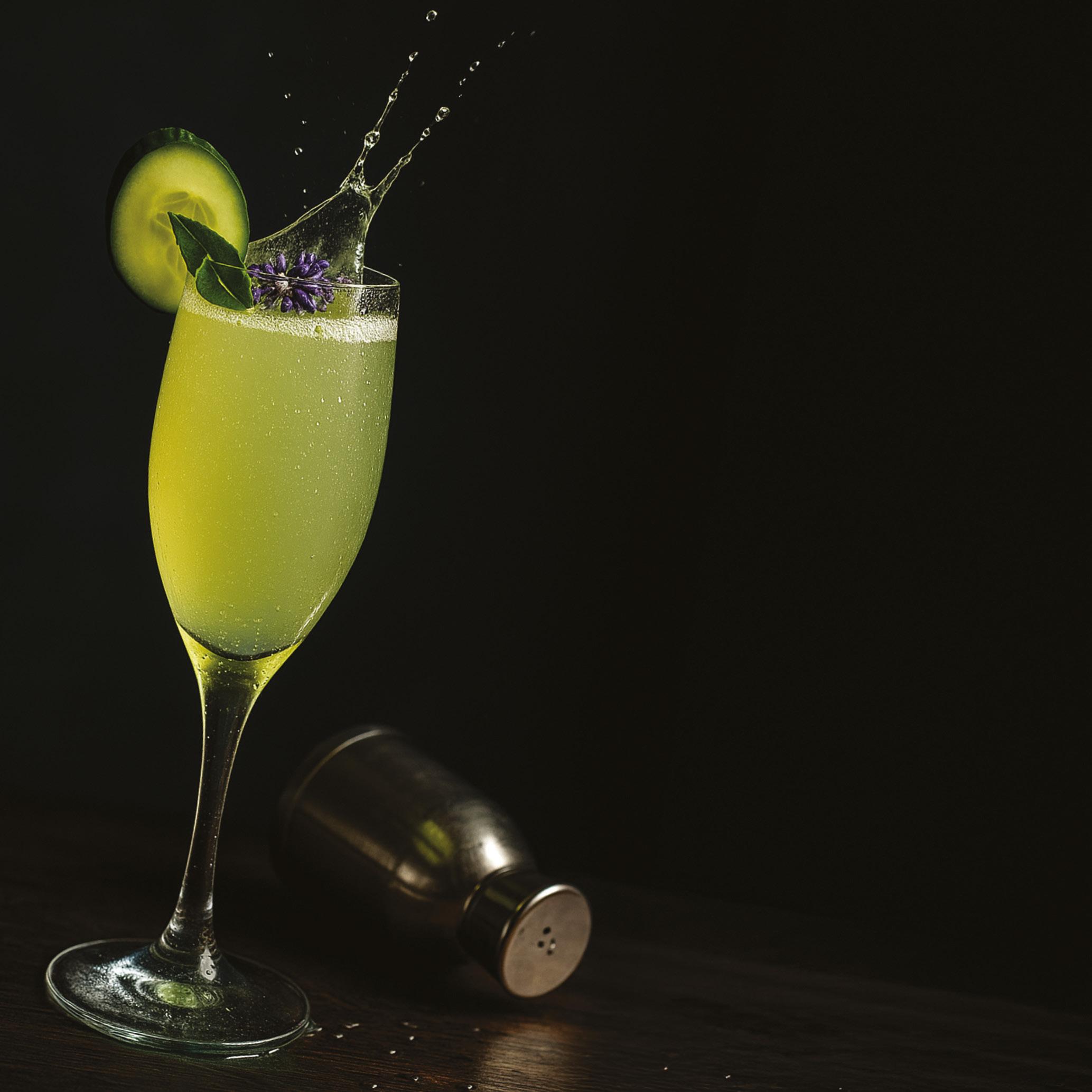 Ron blanco, sake, pepino y lavanda en un trago frío, preciso y visualmente imposible de olvidar.