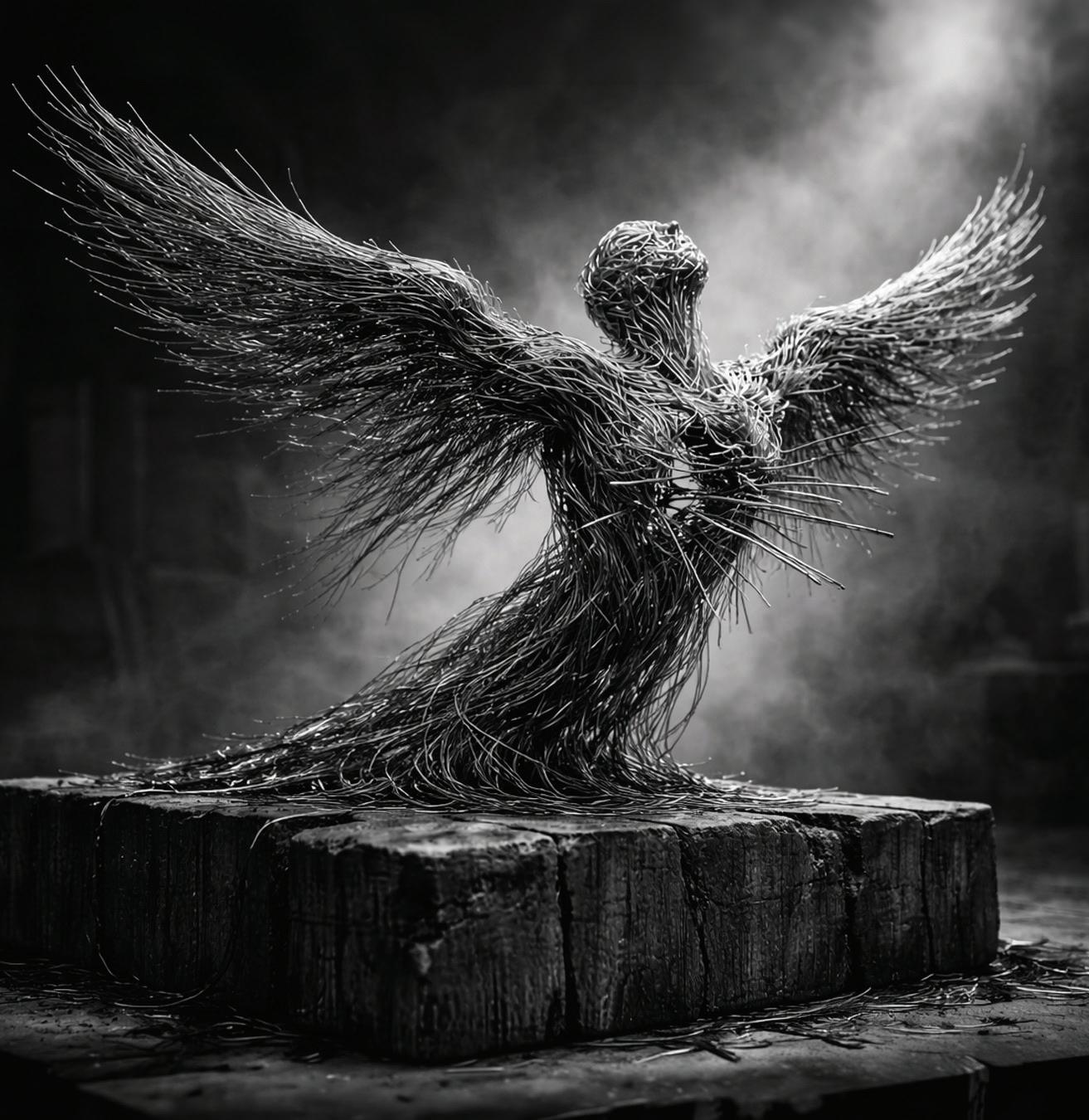 Su primera pieza importante fue el Ángel del Apego Ambivalente. Era monumental. Más de dos metros de altura. Las alas abiertas hacia adelante, inmensas, formadas por miles de filamentos trenzados con precisión quirúrgica. Pero el torso se inclinaba hacia atrás. El cuello se retorcía levemente. Los brazos, extendidos, estaban construidos con espirales cruzadas que generaban nudos imposibles de desatar. La figura parecía abrazar… y huir al mismo tiempo.