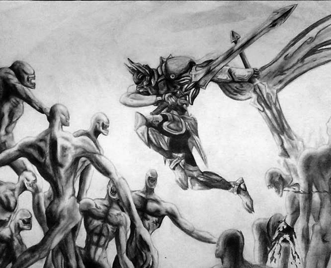 Os dois aproximaram-se novamente e o anjo fincou a espada na perna do caído. A menina que observava tudo de longe assustou-se e tentou ir para trás, mas acabou fazendo barulho quando pisou a barra do longo vestido e caiu sentada em cima de alguns galhos que se quebraram com seu peso. O anjo distraiu-se ao olhar em sua direção e o caído, aproveitando esse momento de distração, acertou-lhe a foice no peito, abrindo um rasgo na armadura e fazendo um corte superficial. Apesar da superficialidade do ferimento, a proteção do anjo estava encharcada de sangue. Ele avançou em direção ao caído e tentou um golpe com a espada, mas o inimigo revidou. O anjo então aplicou uma sequencia de golpes mais rápidos do que o adversário pôde defender e então a foice do inimigo foi jogada longe. O celestial sem mais demora enfioulhe a espada na barriga, o caído cuspiu sangue e, antes de balbuciar qualquer coisa, teve a cabeça cortada pela lâmina flamejante.