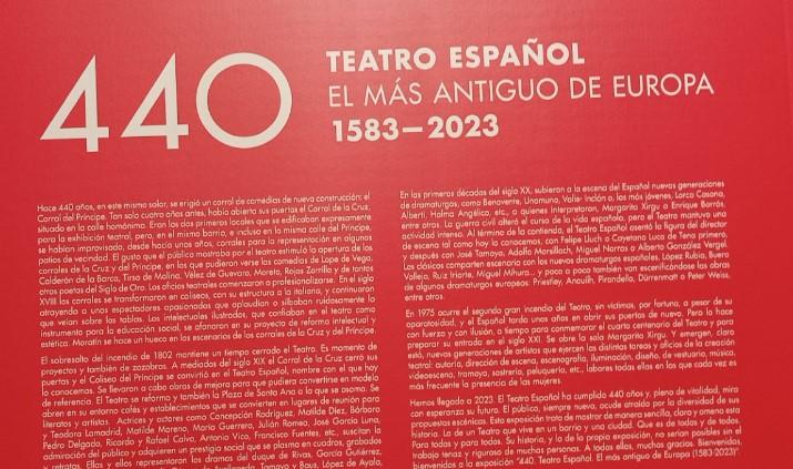 Hemos llegado a 2023.el Teatro Español ha cumplido 440 años y, pleno de vitalidad, mira con esperanza su futuro. El público, siempre nuevo, acude atraído por la diversidad de sus propuestas escénicas. Esta exposición trata de mantener de manera clara, amena ysencillaestahistoria.LadeunTeatro que vive en un barrio y en una ciudad. Que es de todas y de todos. Para todas y para todos. Su historia, y la de la propia exposición, no serían posibles sin el trabajo tenazyriguroso de muchaspersonas.