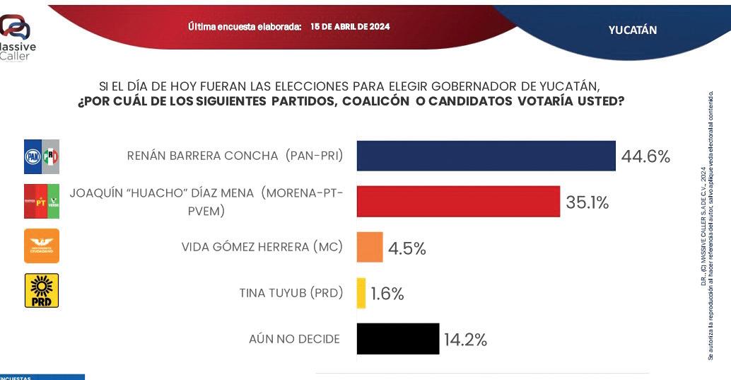 En intención del voto para la gubernatura de Yucatán, según Massive Caller. Renán Barrera Concha, aventaja con 44.6 por ciento, contra 35.1 por ciento del Candidato de Morena Joaquín Díaz Mena. Realizada el 15 de abril, en la técnica robot, a través de grabaciones enviadas a los hogares.