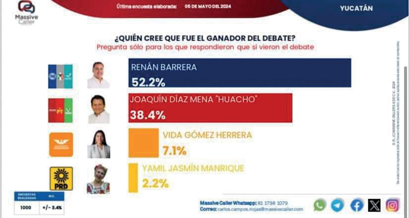 En tanto, Massive Caller también le da la victoria en el debate a Barrera Concha, con un 52.2 por ciento entre los que vieron el ejercicio político. Le sigue Joaquín Díaz Mena con 38.4 por ciento, Vida Gómez con 7.1 por ciento y Tina Tuyub con 2.2 por ciento.