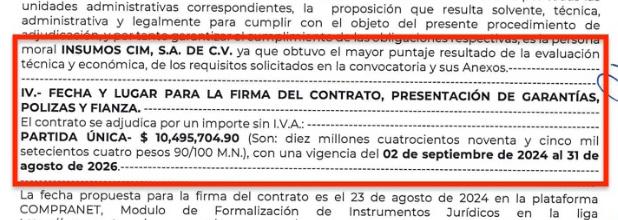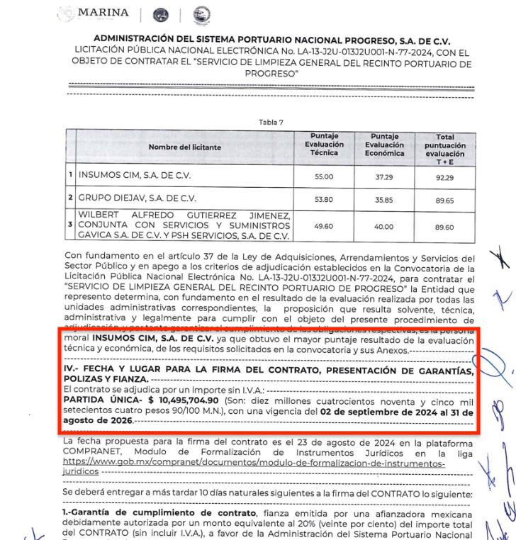 CV no fue la más económica, Carlos Eduardo Ortiz Piñera, Gerente de Administración y Finanzas de la ASIPONA-Progreso, determinó entregar el servicio de limpieza entre el 2 de septiembre de 2024 al 31 de agosto de 2026 a la firma veracruzana. Según el contrato, los pagos del contrato se realizarán de la siguiente manera: En el ejercicio 2024 un monto total de $2,029,169.63 pesos, un monto mensual de $507,292.41 pesos; para el 2025 la cantidad de $6,087,508.88