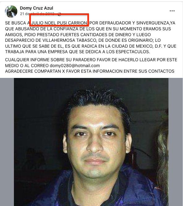 En 2013, a través de la red Facebook, un usuario denunciaba a través de una publicación a Julio Noel Pusi Carrión, lo señalaba de presunto defraudador y sinvergüenza, ya que abusando de la confianza de amigos, pidió fuertes sumas de dinero para luego desaparecer. Años después, aparece en Yucatán como un prominente empresario y promotor de artistas con contratos que suman la millonaria cifra de $88 millones 372 mil 94.07 pesos.