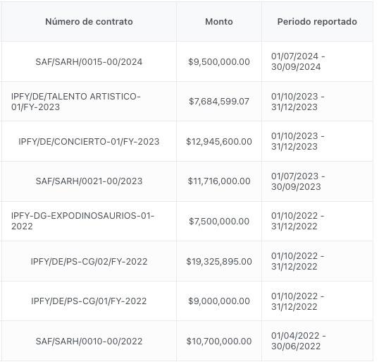 El contrato IPFY/DE/TALENTO ARTISTICO-01/FY-2023 fue por un monto de $7 millones 684 mil 599.07 pesos para la presentación de un elenco conformado por el show cómico de ‘Taco de Ojo’; ‘El Chivo su grupo Sombra’; presentación del Team Infierno, de la Casa de los Famosos, conformado por Wendy Guevara, Nicola Porcella, Poncho de Nigris, Sergio Mayer, Emilio Osorio y Apio Quijano; musical ‘Paleto’; grupo musical Los Vela; show cómico de ‘Octavio Ayil y Candita; ‘Viri Primavera’; Lluvia con Sol; show cómico “Lalo Salazar, el Box”; Alfredo ‘El Pulpo de los Teclados; Vanessa Huppenkoten, Fernando Palomo y Roberta Rodríguez; Las Perdidas (Wendy Guevara, Paola Suárez y Kimberly Irene); y ‘Tropidermis’, entre otros.