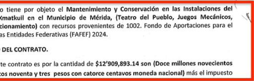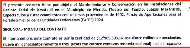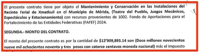 El objeto del contrato mantenimiento y conservación en las instalaciones del recinto ferial de Xmatkuil: teatro del pueblo, juegos mecánicos, espectáculos y estacionamiento, por un monto de $14 millones 975 mil 476.04 pesos.