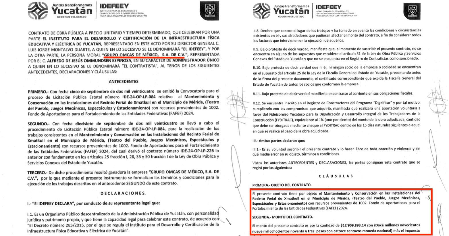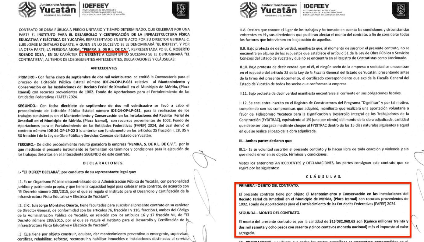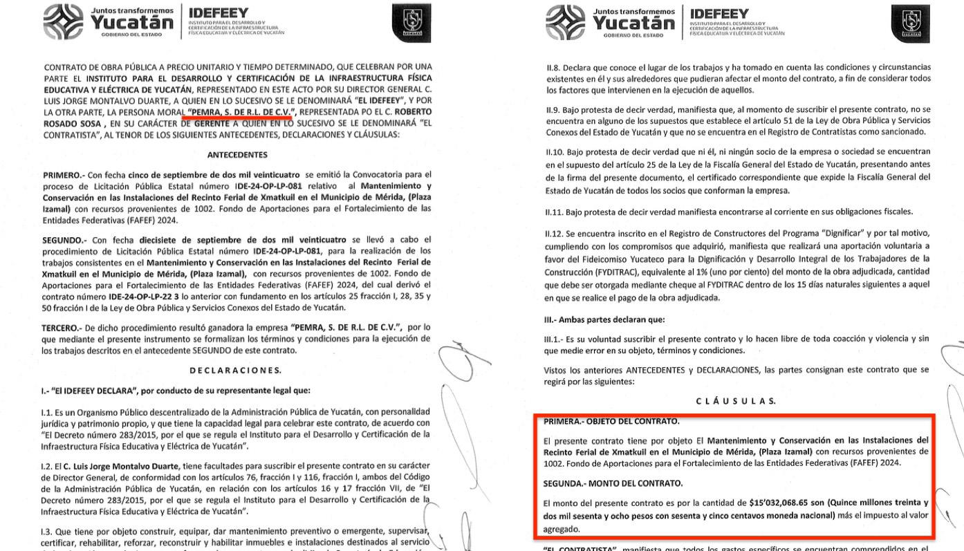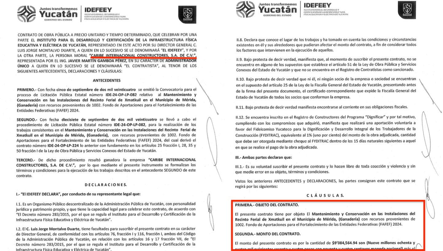 Corporativo M.Y.M. SA de CV, de Manuel Ortiz Muñoz y Laura Elena Barrero Fagoaga, signó el pasado 25 de septiembre, el contrato IDE-24-OP-LP-225 para mantenimiento y conservación en las instalaciones del Palenque del recinto ferial de Xmatkuil por un monto de $11