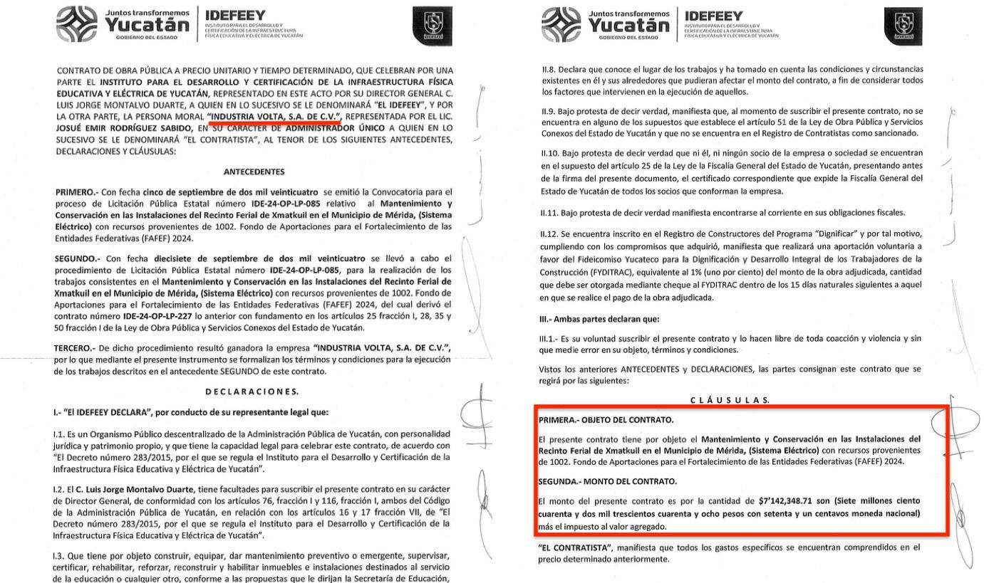 La razón social Industria Volta SA de CV, que actualmente tiene como socios a Pedro Andrei Espadas Rejón y Raúl Roberto Gamboa Aguilar, que firmó el 25 de septiembre el contrato IDE-24OP-LP-227 para el mantenimiento y conservación del sistema eléctrico en las instalaciones del recinto ferial de Xmatkuil por un monto de $8 millones 285 mil 124.50 pesos.