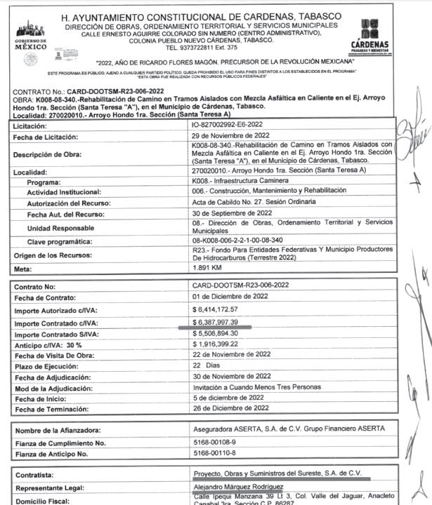 El más emblemático por su monto fue el 2022-B05-B57-CD-27-RF-LP-AOR-0091 para la reconstrucción de Barrote Natural con Protección Marginal en la Margen Derecha del Río Samaria (Etapa I), en la Localidad de Cucuyulapa Primera Sección, Cunduacán, por 20 millones 85 mil 354.66 pesos. Es decir, en total la empresa Proyectos, Obras y Suministros del Sureste SA de CV ha facturado por todo los contratos en Tabasco, Campeche, Chiapas y Conagua un total de $198 millones 134 mil 996.01 pesos, lo que permite a Alejandro Márquez Ramírez darse una vida rodeada de lujos.