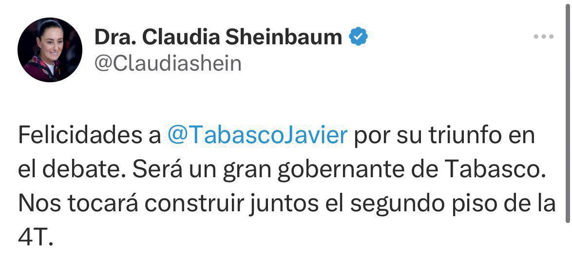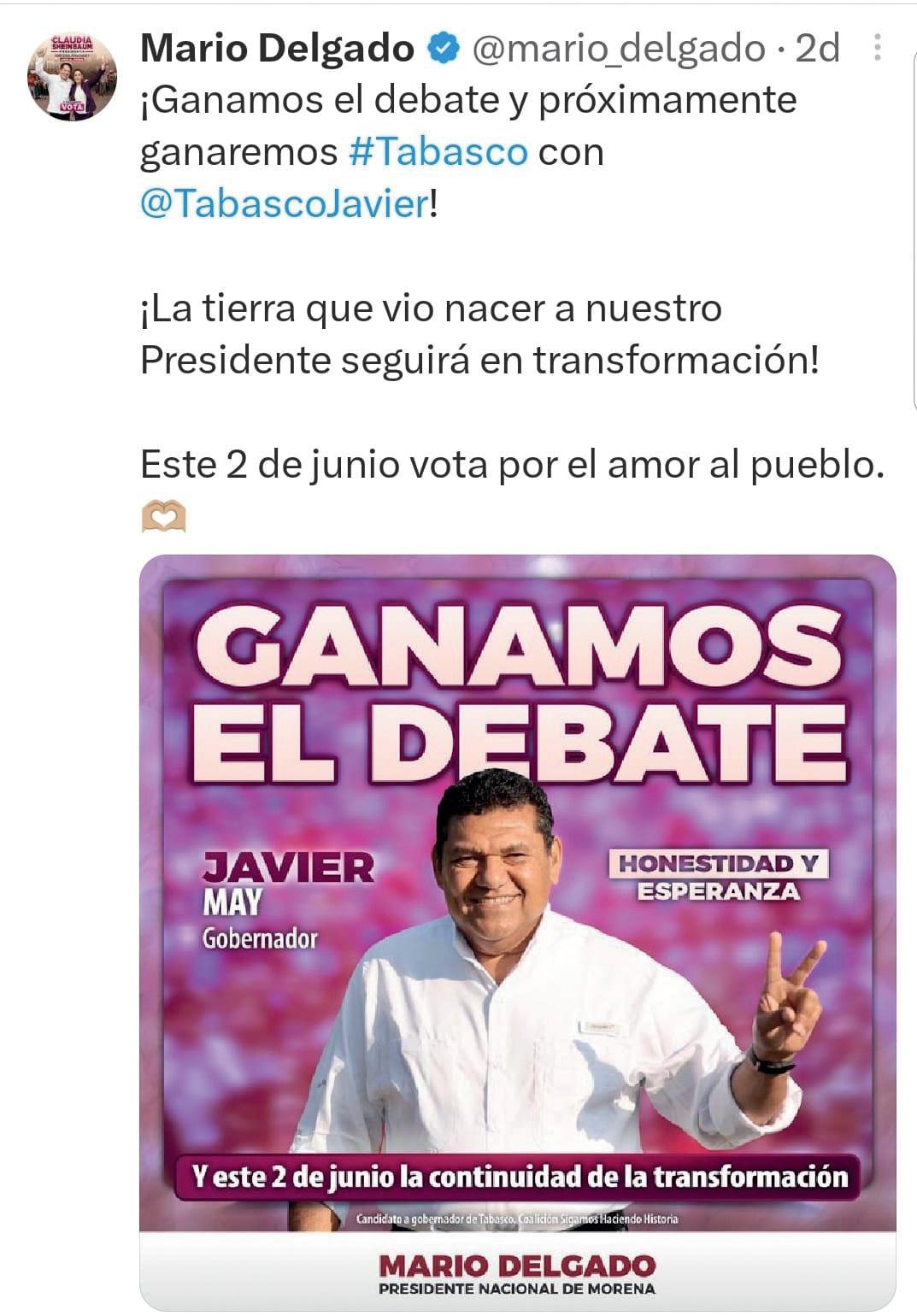A la cita del debate llegaron todos. Ahí están, ahí estaban María Inés de la Fuente Dagdug, de Movimiento Ciudadano; Lorena Beaurregard de los Santos, del PAN y PRI (Fuerza y Corazón por Tabasco); Javier May Rodríguez, de Morena, de la coalición Sigamos Haciendo Historia, conformada por PT y PVEM; y Juan Manuel Fócil Pérez, del partido del sol azteca, PRD. Y como dicen, dato mata relato. Y es por eso que Javier May Rodríguez ganó con propuestas el primer debate por la gubernatura de Tabasco, organizado por el Instituto Electoral y de Participación Ciudadana (IEPCT), y afirmó que ha seguido creciendo en las preferencias ciudadanas.