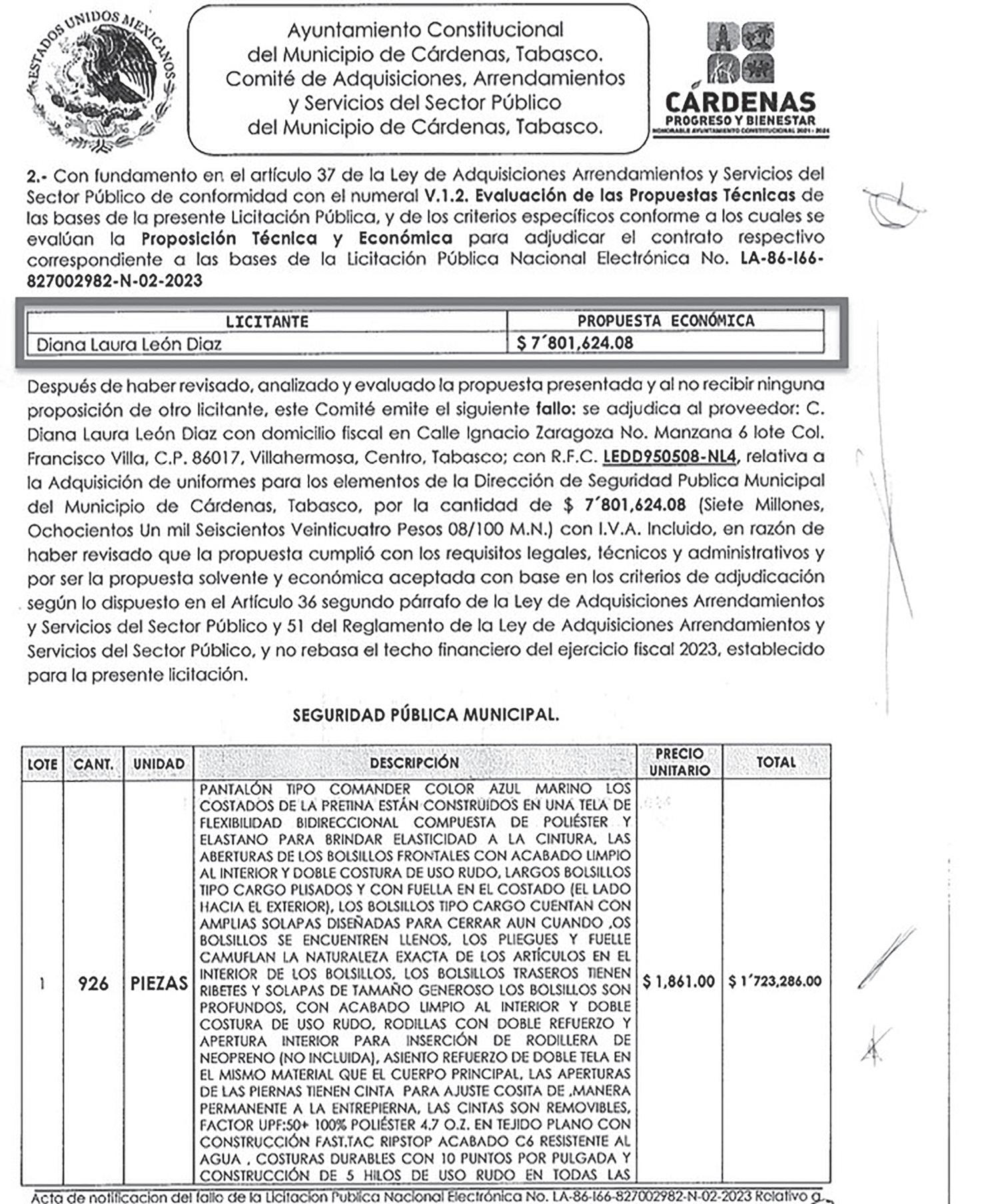 La proveedora Diana Laura León Díaz volvió a ganar un nuevo contrato para surtir uniformes y calzado a la policía municipal de Cárdenas por un monto de 7 millones 801 mil 624.08 pesos, con lo que gana su tercer contrato consecutivo y suma ventas por 30 millones 503 mil 410.12 pesos en el actual trienio de la alcaldesa María Esther Zapata Zapata.