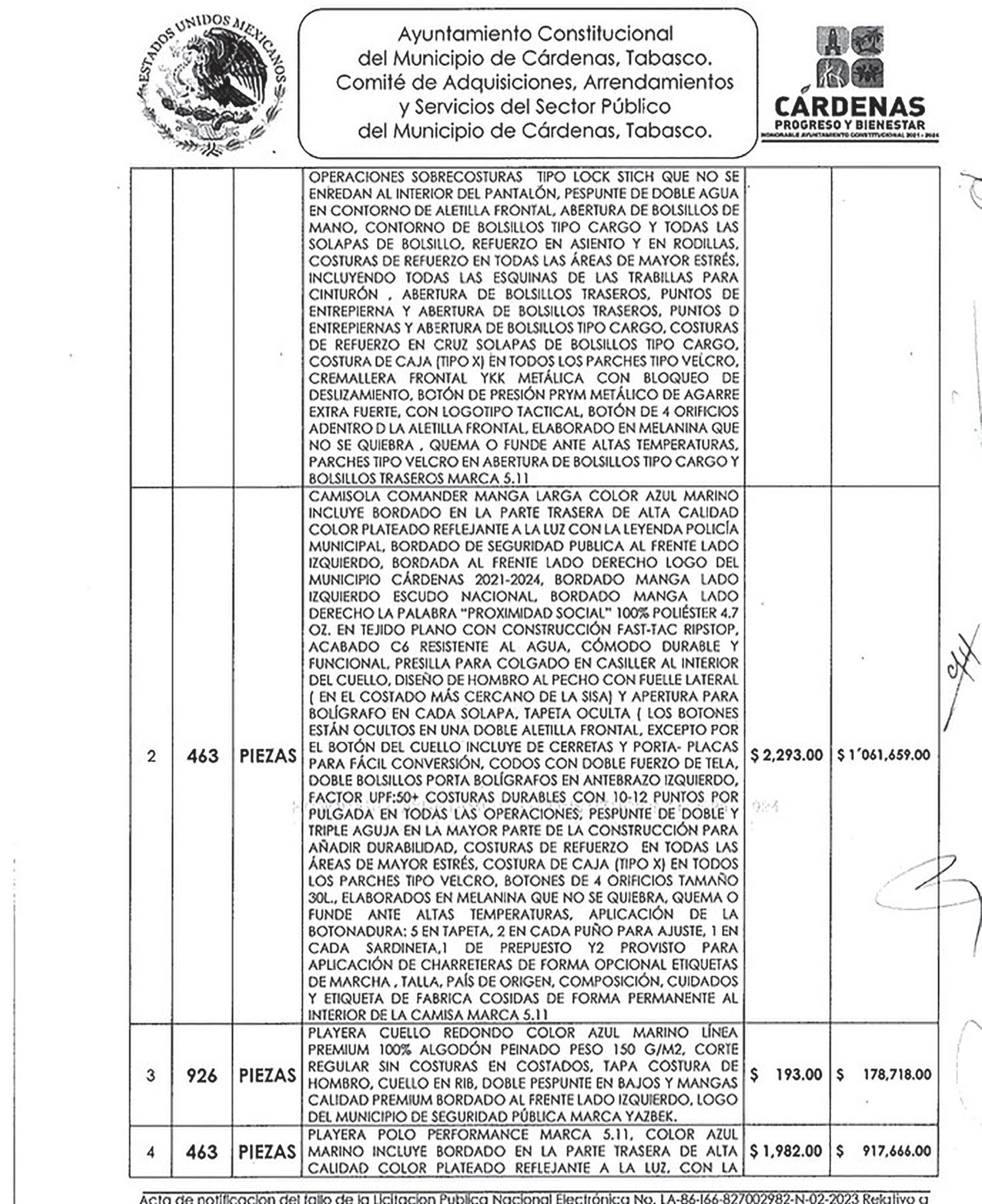 Por ejemplo: el Ayuntamiento de Cárdenas pagó $1,861 pesos por cada uno de los 926 pantalones tipo comander color azul marino, que haría un total de $1,723,286 pesos; $2,293 pesos por cada una de las 463 camisas para un total de $1,061,659 pesos.