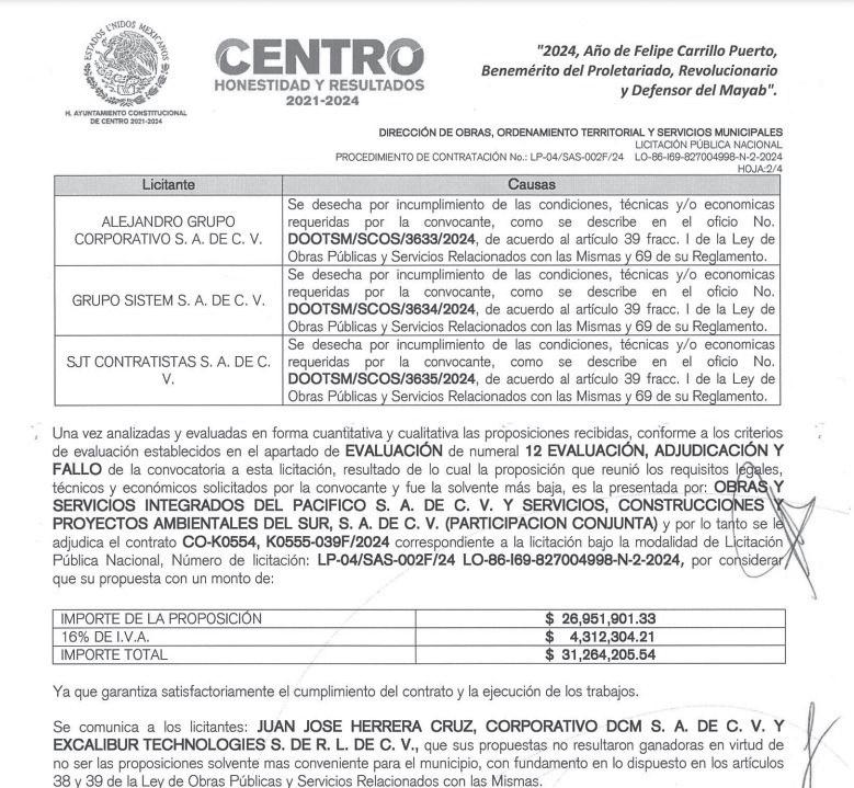 Pese a no ser la oferta más económica, pues ante de ella había tres propuestas más bajas: Alejandro Grupo Corporativo SA de CV, de Alejandro Priego Pérez, que ofertó por la obra un monto de $29,792,689.20 pesos; SJT Contratistas SA de CV, que no tienen antecedentes de contratos y es administrada por Alberto Sastré Arias, con $29,942,870.30 pesos; Grupo Sistem SA de CV, de Antonio Guichard Montalvo y Alejandro Olán Niño, que ofertaron $29,966,465.48 pesos, los funcionario de Centro decidieron darle el contrato.