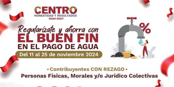 Bajo el lema “Regularízate y ahorra con el Buen Fin”, el Gobierno de Centro invita a los contribuyentes a aprovechar el Programa de Incentivos Fiscales para el pago del impuesto predial y los derechos por consumo de agua potable que estarán vigentes desde el lunes 11 al lunes 25 de noviembre de 2024.