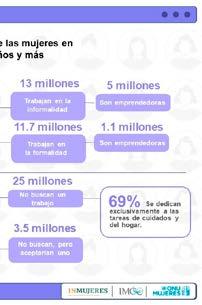 • Altas tasas de informalidad. 55% de las mujeres tienen un empleo dentro de la informalidad en comparación con 49% de los hombres en esta misma situación. Esto implica que más de la mitad de las trabajadoras en el país no tiene certidumbre jurídica, carece de acceso a servicios de salud y no cuenta con prestaciones laborales. En otras palabras, sus posibilidades de acceder a servicios de salud y protección social están sujetas a la formalidad de su trabajo. La informalidad también implica que las mujeres en esa situación ganan, en promedio, 48% menos que sus pares en trabajos formales.