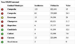 manera violenta, de acuerdo con estadística del Secretariado Ejecutivo del Sistema Nacional de Seguridad Pública (SESNSP), y detallada en municipios por Semáforo Delictivo de Campeche.