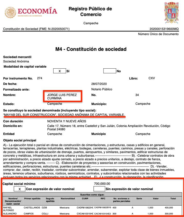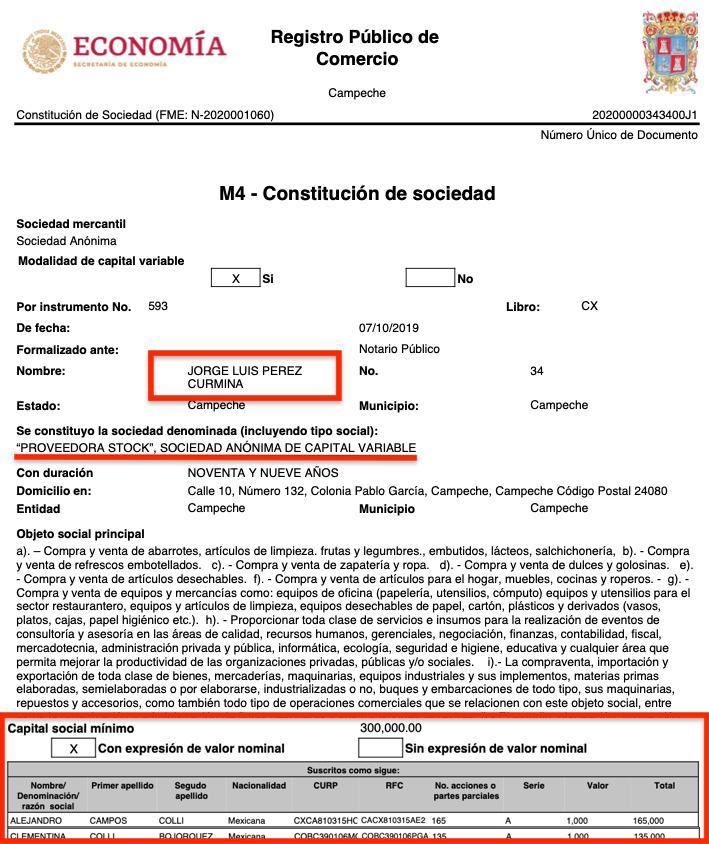 Según documentos oficiales, la empresa fue constituida el 7 de octubre de 2019 ante el mismo notario Jorge Luis Pérez Curmina, pero por los accionistas Alejandro Campos Colli y Clementina Colli Bojórquez.