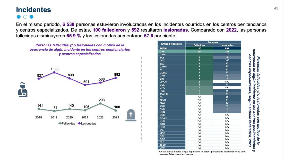 A nivel nacional, los incidentes en centros penitenciarios incluyen riñas (37.8%), daños a la infraestructura (1.0%), manifestaciones de inconformidades (0.8%), fugas (0.5%), motines (0.2%) y otros (58.5%).