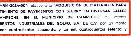 A través de la licitación pública nacional LA-63-004-804002999-N-3- 2024, relativa a la adquisición de materiales para la rehabilitación de revestimiento de pavimentos con slurry en diversas calles de San Francisco de Campeche, el proveedor Recubrimientos y Mantenimientos Industriales del Golfo SA de CV se hizo de un nuevo contrato para