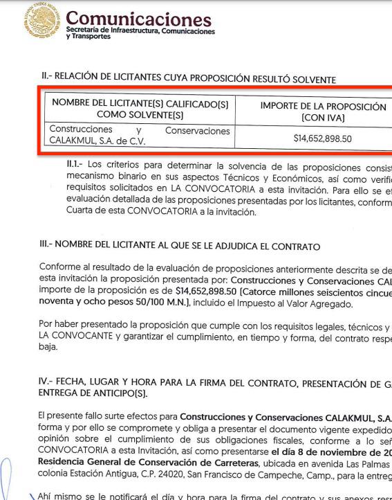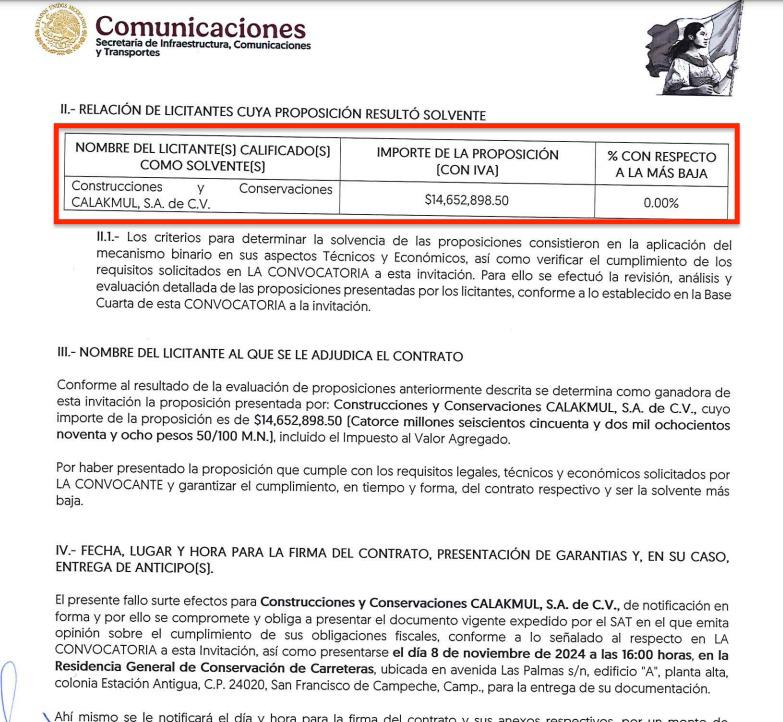 El único contrato adjudicado para obras viales fue a través de la licitación IO-09-211-009000959-N-260-2024 para conservación rutinaria de tramos en 243.57 km, en las rutas 180, 186, 201 y 259 de las vías federales correspondientes a Campeche, que fue adjudicada a la empresa Construcciones y Conservaciones Calakmul SA de CV, de Jorge Manuel Gordillo Coral, por un monto de $14,652,898.50 pesos.