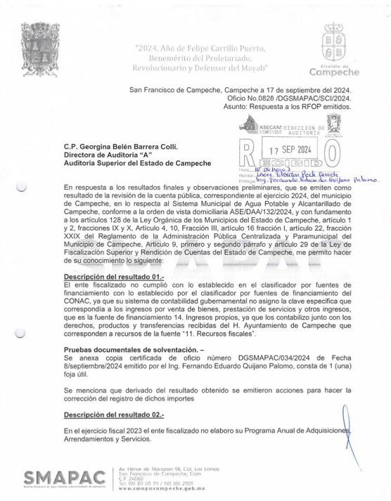 versión Pública Productiva del Municipio de Campeche y Sistema Municipal de Agua Potable y Alcantarillado de Campeche Smapac. En el Sistema Municipal de Agua Potable y Alcantarillado de Campeche Smapac, la auditoría detectó un probable desvío de 7 millones 592 mil 136.40 pesos. Entre las irregularidades se dectaron pagos por $1,625,459.52 a cinco proveedores de los que se advierte que no tienen registradas ante el Servicio de Administración Tributaria ninguna actividad económica; $991,200 pesos por la