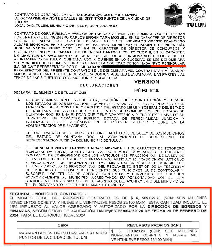 Por su parte la empresa RYO Peninsular SA de CV este año ya firmó otros tres contratos en Tulum: HAT/ DGIP/DCyC/COPLP/RP/014/2024, por $6 millones 989 mil 29.23 pesos para la pavimentación de calles en distintos puntos de la ciudad; HAT/DGIP/DCyC/ COP3P/RP/010/2024, por $2 millones 989 mil 483.04 pesos para la pavimentación en la Avenida La Selva, entre la Av. 5 y Av. 10 Norte; por último, HAT/DGIP/ DCyC/COP3P/FAISMUN/005/2024, por $2 millones 987 mil 280.86 pesos para la construcción de parque público de la