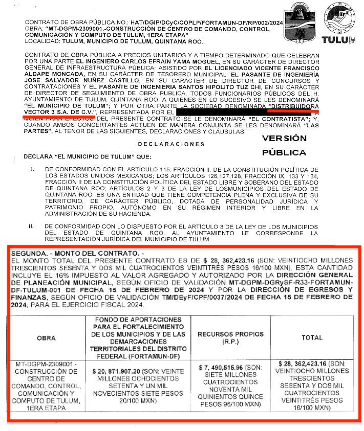 En 2024, Distribuidora Vector 3 SA de CV firmó el pasado 15 de marzo, el contrato identificado como HAT/ DGIP/DCyC/COPLP/FORTAMUN-DF/ RP/002/2024 para la construcción de Centro de Comando , Control, Comunicación y Cómputo (C-4) de Tulum (Primera Etapa) por un monto de $28 millones 362 mil 423.16 pesos. El año pasado firmó el contrato HATDGIP-DCyC-COPLP-R28-001-2023