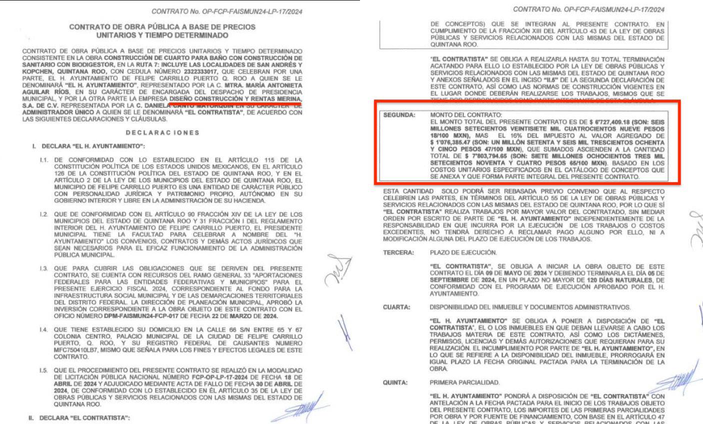 más participó en el proceso de licitación FCP-OP-LP-53-2023, por lo que el 6 de noviembre de 2023 Apolinar Acosta Guzmán, Director de Obras Públicas de FCP les adjudicó la obra. El siguiente contrato fue el OP-FCPFAISMUN24-LP-17/2024, fechado el 3 de mayo de 2024, para la construcción de cuarto para baño con construcción de sanitario con biodigestor en la Ruta 7, incluye las localidades de San Andrés y Kopchen por un monto de $7 millones 803 mil 794.65 pesos. Como en la anterior, pese a que se trataba de una licitación pública nacional, extrañamente Diseño de Construcción y Rentas Merina fue la única que participó en el concurso.