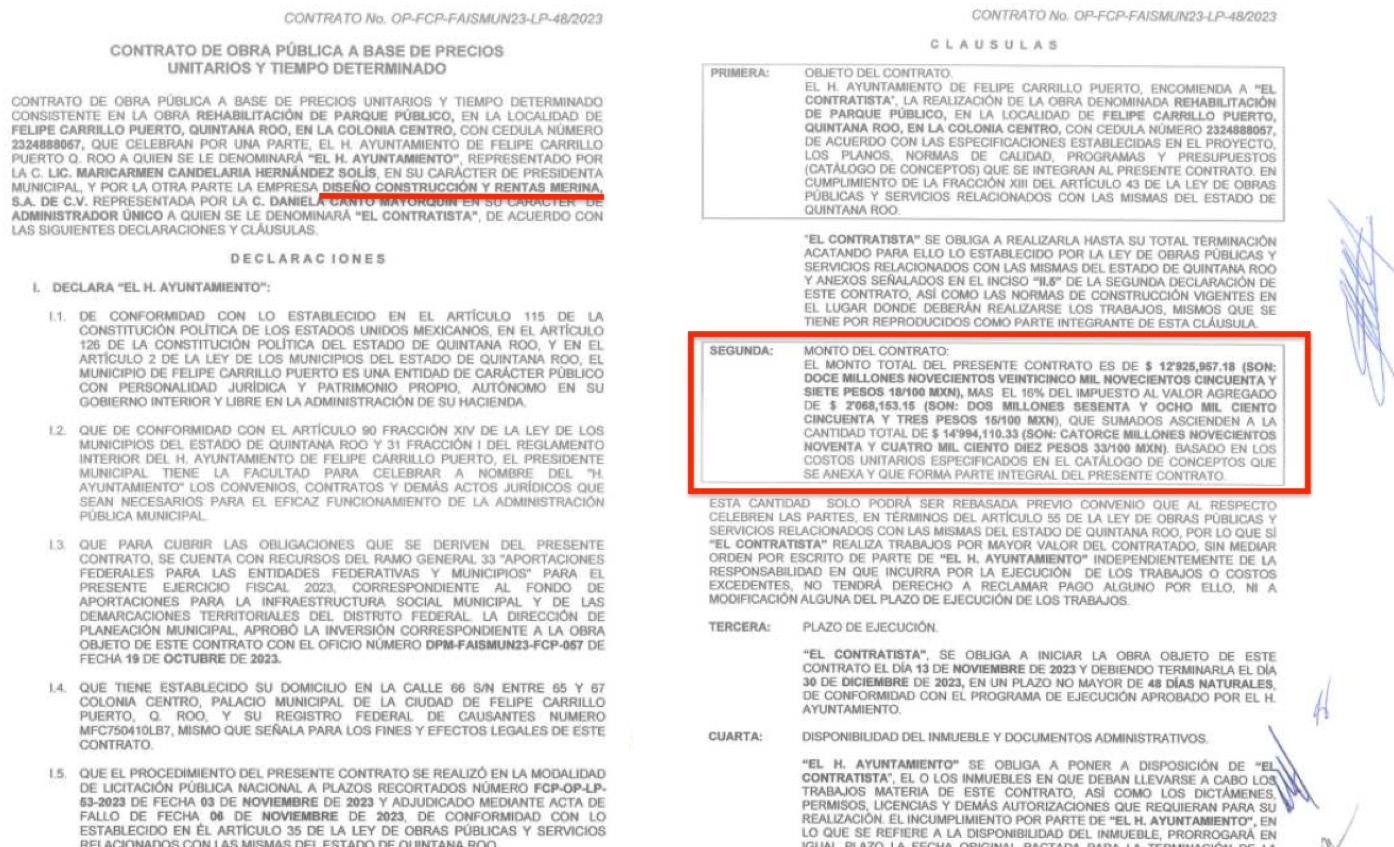 El Ayuntamiento de Felipe Carrillo Puerto en siete meses otorgó tres contratos a la empresa Diseño de Construcción y Rentas Merina SA de CV por más de 27.6 MDP