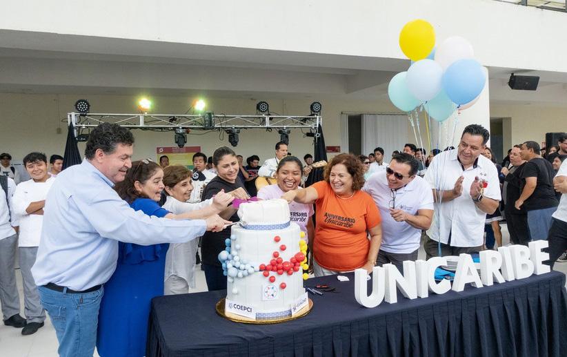 la música de mariachi para cantar “Las Mañanitas” a la Unicaribe, su Rectora, Marisol Vanegas Pérez, felicitó al estudiantado, acompañada del personal directivo de la institución. Integrantes del Coro Universitario interpretaron diversas canciones acompañados por el Mariachi, al igual que estudiantes que se animaron a “echarse un palomazo”.