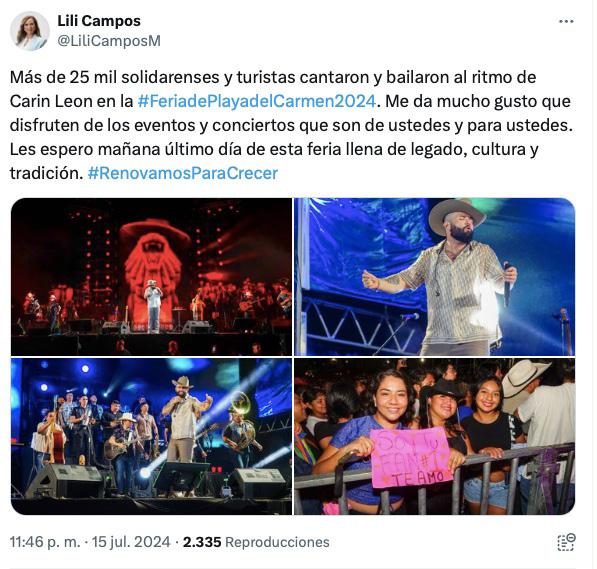 A través de su cuenta oficial de X (antes Twitter) la entonces alcaldesa de Solidaridad, Lilí Campos Miranda, presumía que al concierto de Carin León asistieron más de 25 mil personas, lo que no reveló es que por el show del